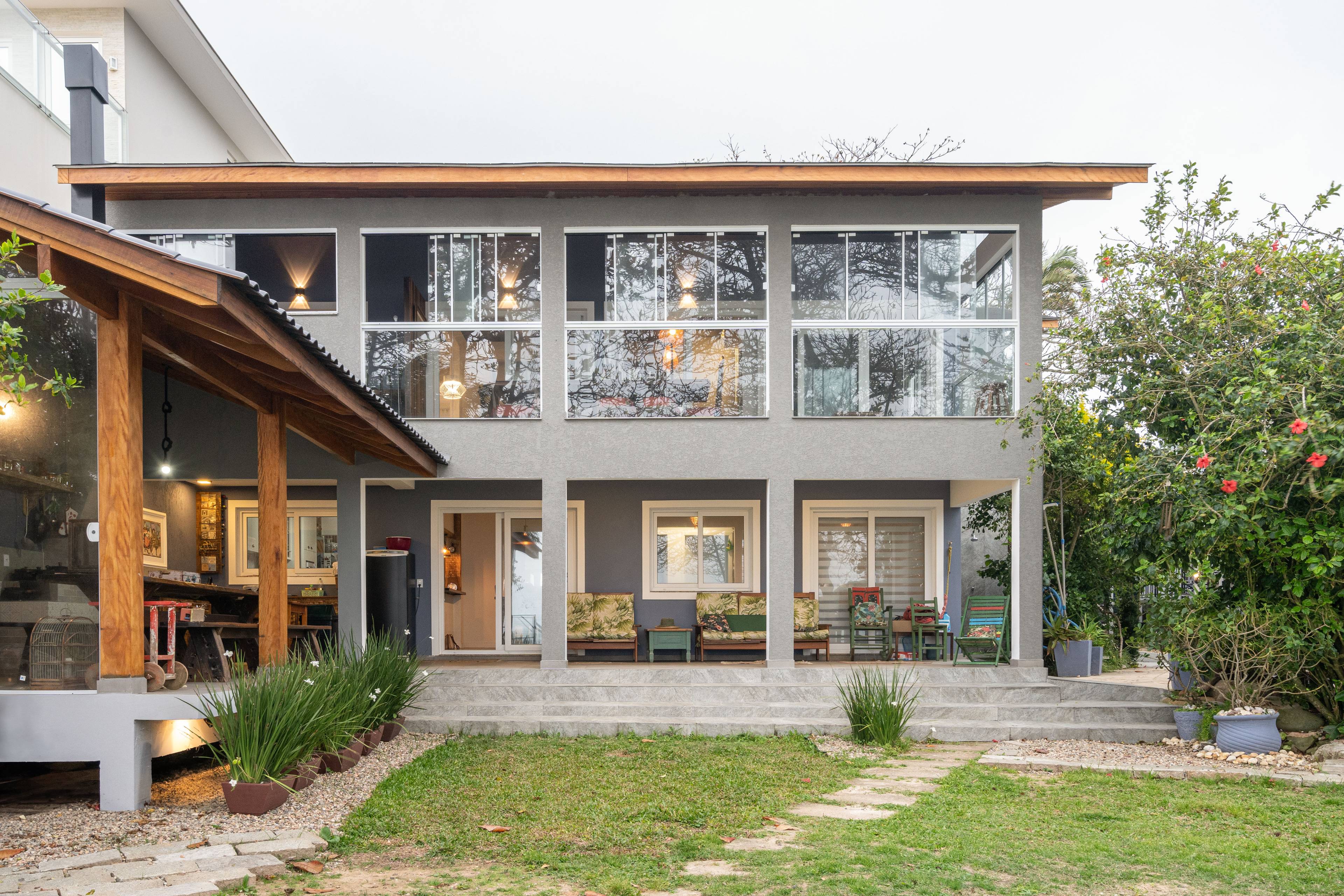 A casa originalmente de um pavimento bastante antiga tinha parte das fundações em tijolo maciço intertravado e por isso então fizemos uma um reforço na estrutura para receber o segundo pavimento, no entanto, ainda assim no pavimento superior usamos piso vinílico, telhado em madeira, com telha shingle, argamassa colante para os tijolos da marca Dun-Dun, enfim diminuindo assim bastante o peso do segundo pavimento.